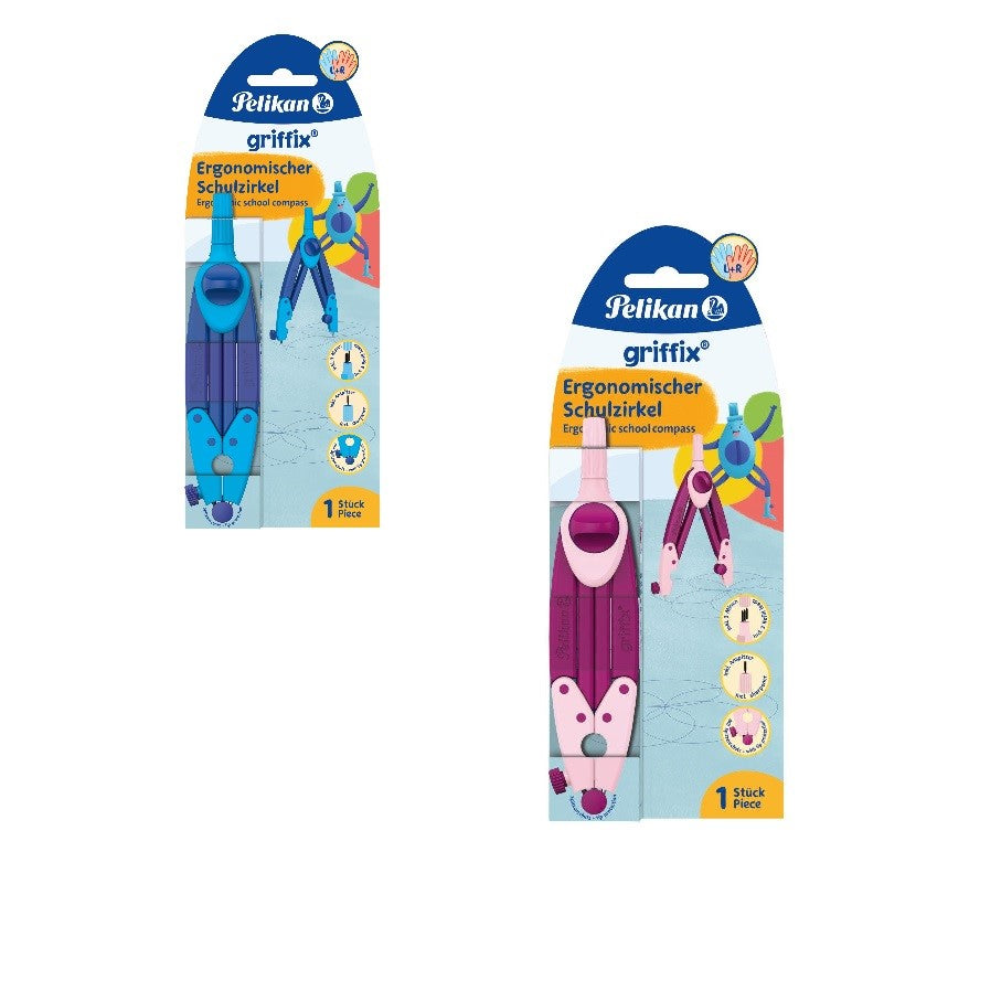 Compas școlar ergonomic Griffix, include 3 rezerve mină + ascuțitoare. Vârful și mina pot fi acoperite când compasul nu este folosit, cu ajutorul unui element de protecție.