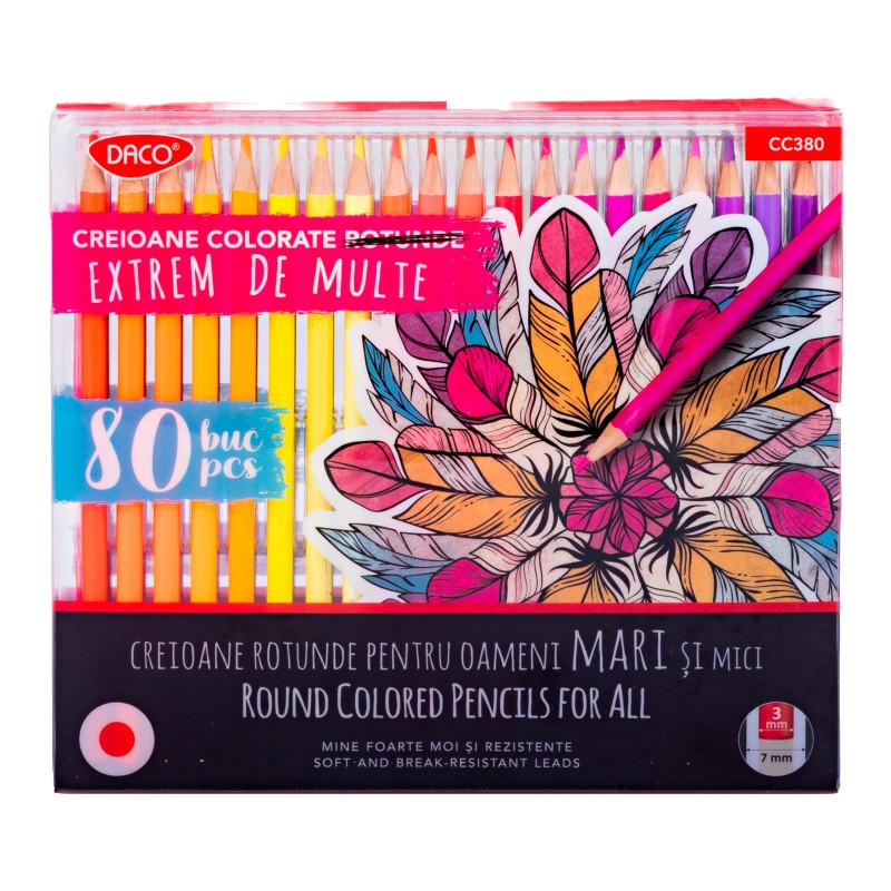 Setul conține 80 creioane colorate, cu pigmenți de calitate foarte bună. Mina este foarte moale și alunecă ușor pe hârtie, pentru o colorare uniformă. Este rezistentă la rupere, dar și la lumină, astfel ca nuanțele vor rămâne la fel de intense timp îndelungat. Creioanele sunt livrate ascuțite și nu conțin lemn provenit din păduri tropicale. De asemenea, au fost create iî conformitate cu normele de siguranță europene EN71-1, 2, 3, fiind sigure de utilizat de către copiii mai mari de 3 ani.