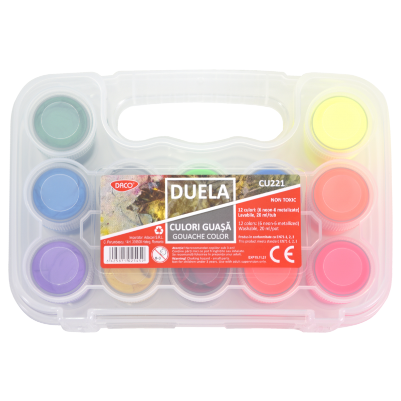 Conține 12 culori: 6 neon și 6 metalice, nuanțe diferite, pigmenți puternici, intenși, lavabile, astfel încât să iți poți concentra atenția pe arta și culoare, fără sa te îngrijoreze micile pete de pe haine.