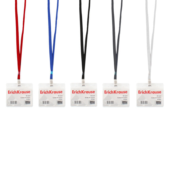 Ecuson orizontală din PVC, culoare transparentă. Șnurul este realizat din poliester și are o clemă metalică. Lățimea șnurului este de 12 mm.