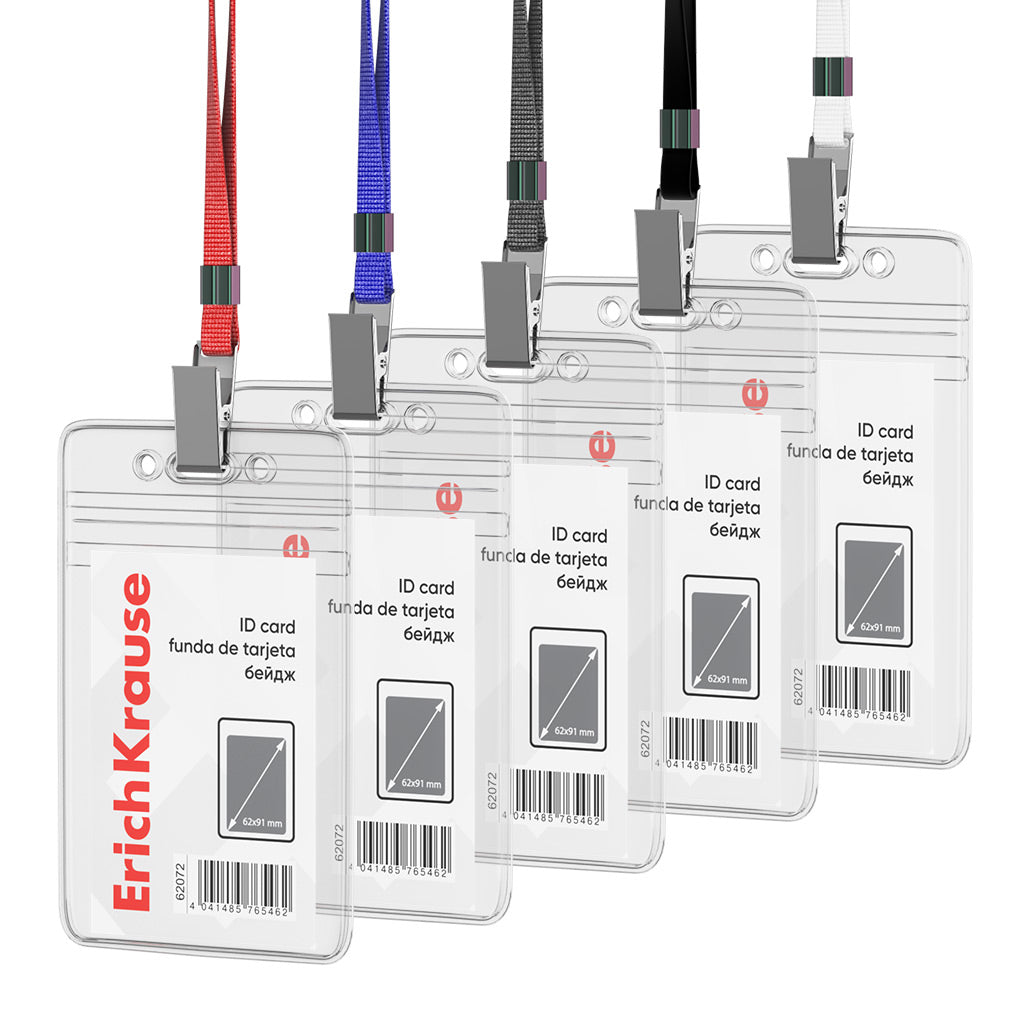 Ecuson vertical din PVC, culoare transparentă. Șnurul este realizat din poliester și are o clemă metalică. Lățimea șnurului este de 12 mm.