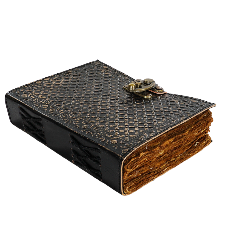 Jurnal Vintage, coperți din piele naturală, cusute manual, hârtie lucrată manual, din bumbac, închizătoare metalică.