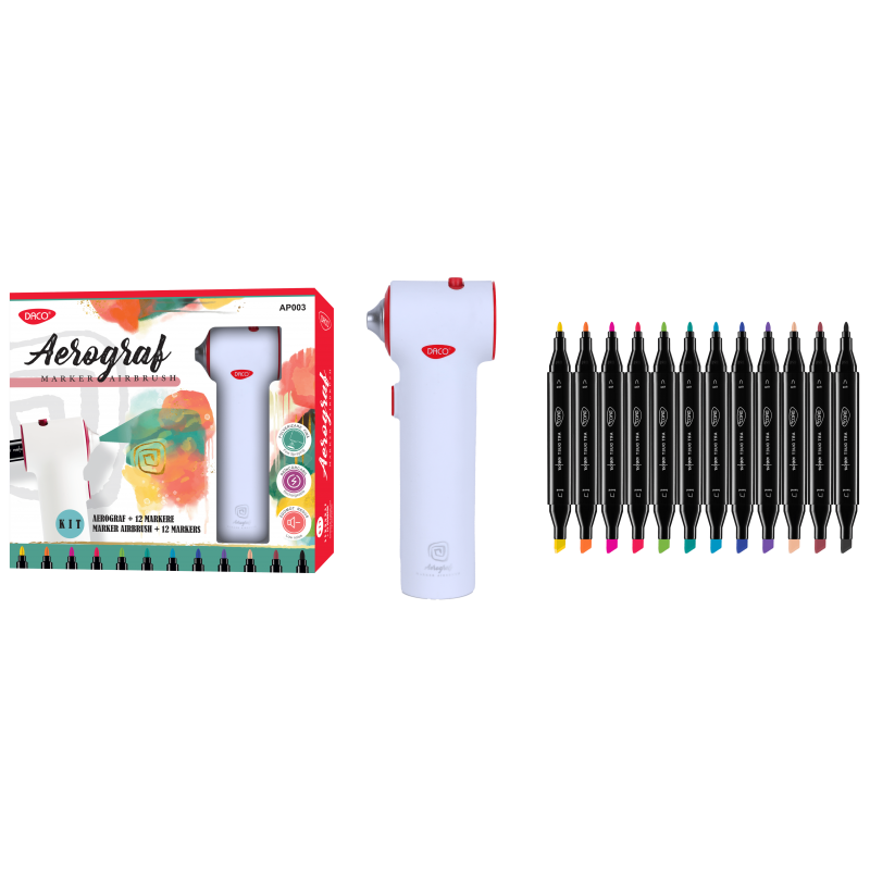 Kitul include un aerograf de înaltă calitate și 12 markere compatibile, oferindu-ți tot ce ai nevoie pentru a începe să creezi efecte de pulverizare uimitoare și detalii complexe.