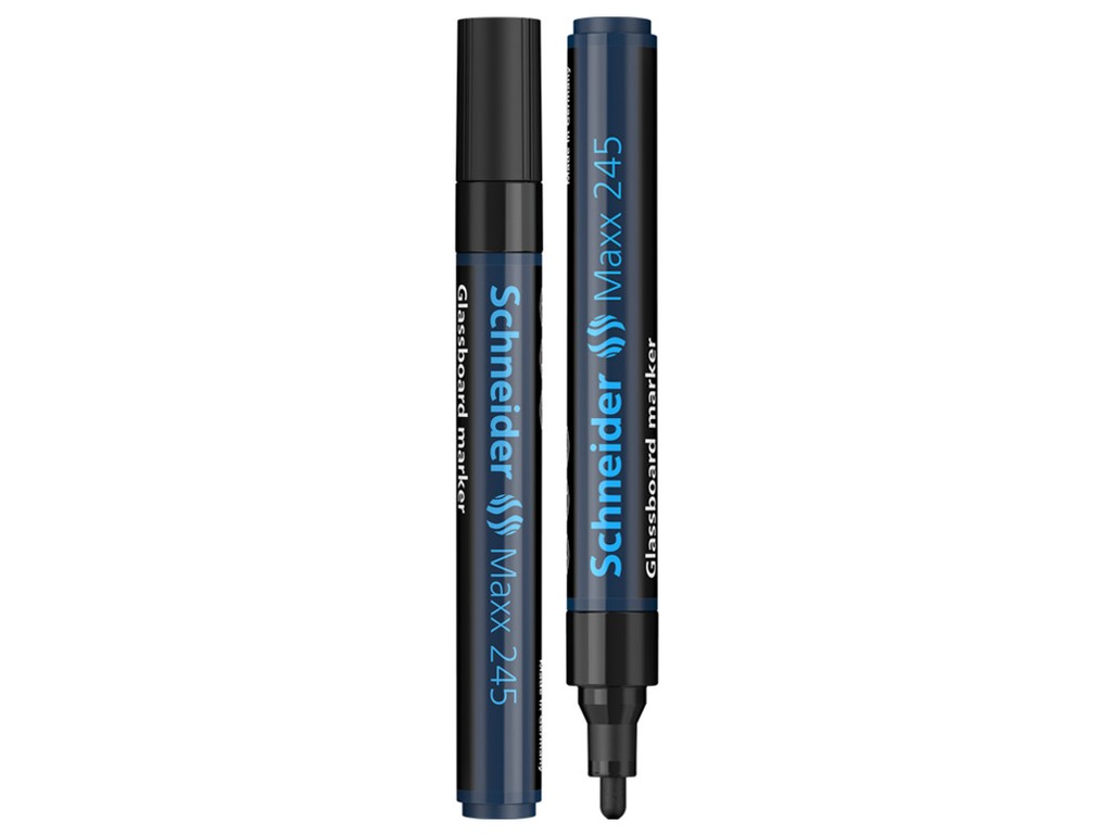 Markerele pentru sticlă Schneider Maxx 245 dispun de un vârf rotund, ideal pentru suprafețele lucioase și tabla de sticlă.