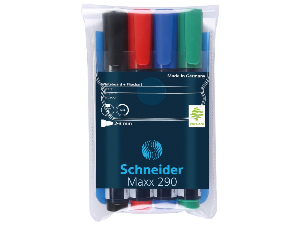 Markerele Schneider pentru whiteboard pot fi folosite și pentru scrierea pe hârtia de flipchart datorită cernelii speciale ce poate fi ștearsă ușor de pe tabla whiteboard și nu se vede pe partea cealaltă a hârtiei de flipchart.
