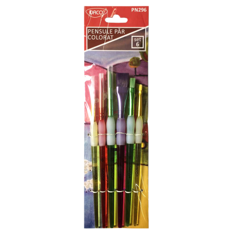 Setul conține 6 pensule cu vârf drept și rotund , păr sintetic color, virola nichelată, de diferite grosimi, ideale pentru tempera, guașe, acrilice sau acuarele. Pensule utile la activitățile de educație plastică, desen, pictură, art & craft. Mărimile incluse sunt: 6, 10, 12, 14.