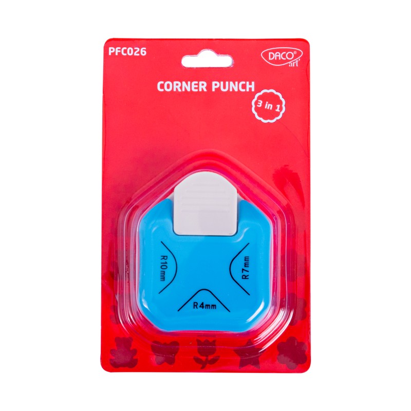3 perforații de colț de dimensiunile 4 mm, 7 mm și 10 mm și poate fi folosit pentru a perfora hârtia, cartonul, poze sau alte proiecte de lucru manual.