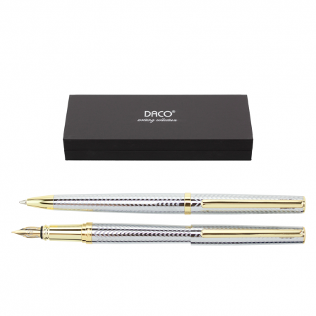 Setul conține pix și stilou. Stiloul este prevăzut cu capac, închidere prin apăsare, peniță din iridium, tip M, cu patron de cerneală sau convertor de cerneală. Pixul are mecanism de acționare prin răsucire, cu mină tip Parker. Corpurile sunt metalice texturate, culoare argintiu cu decorații aurii. Setul este perfect pentru utilizare zilnică sau cadoul potrivit pentru o persoană care iubește scrisul.