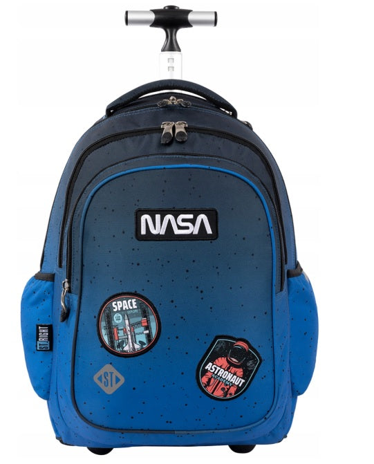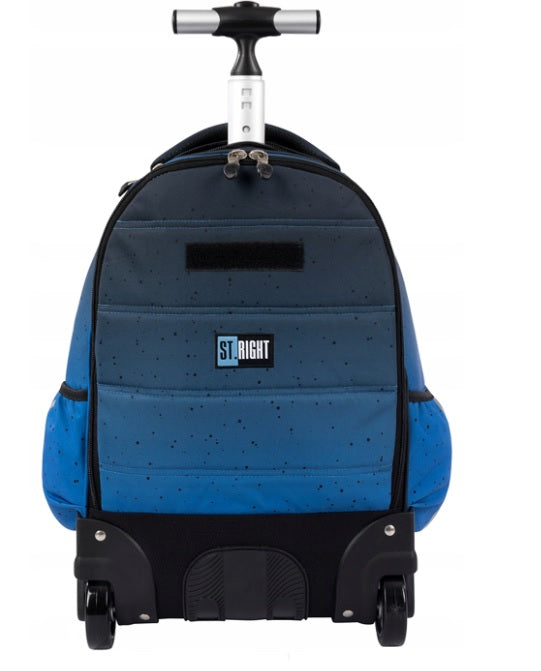 Ghiozdanul St.Right tip Troler, are 4 compartimente, mâner telescopic reglabil pe 2 nivele și roți din silicon.